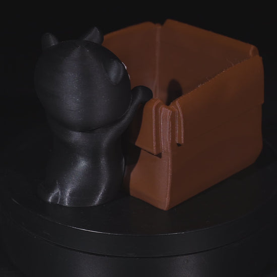 Add a touch of whimsy and mystery to your space with this charming 3D printed cat trinket holder. Standing at 7cm tall, this compact yet eye-catching piece features a sleek, stylized black cat curiously peering into a small open box. The cat’s poised stance and alert ears capture a moment of feline curiosity, making it both functional and decorative.