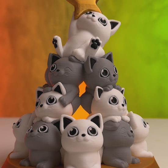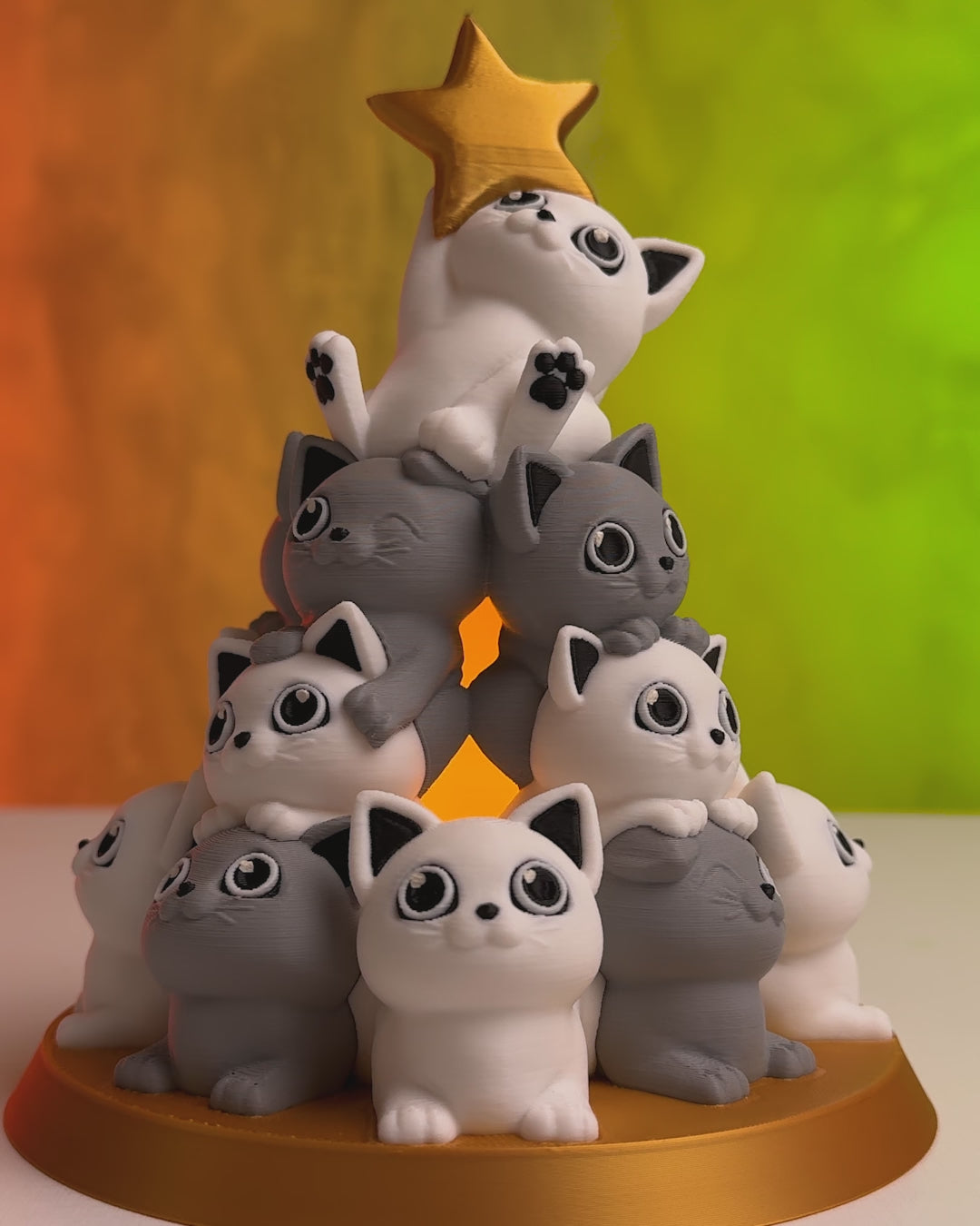 For the cat lover who has everything (except maybe this!), meet the Kitten Tree — a playful 3D-printed sculpture standing about 17 cm tall, featuring an adorable pyramid of kittens stacking their way to the top to place a golden star!