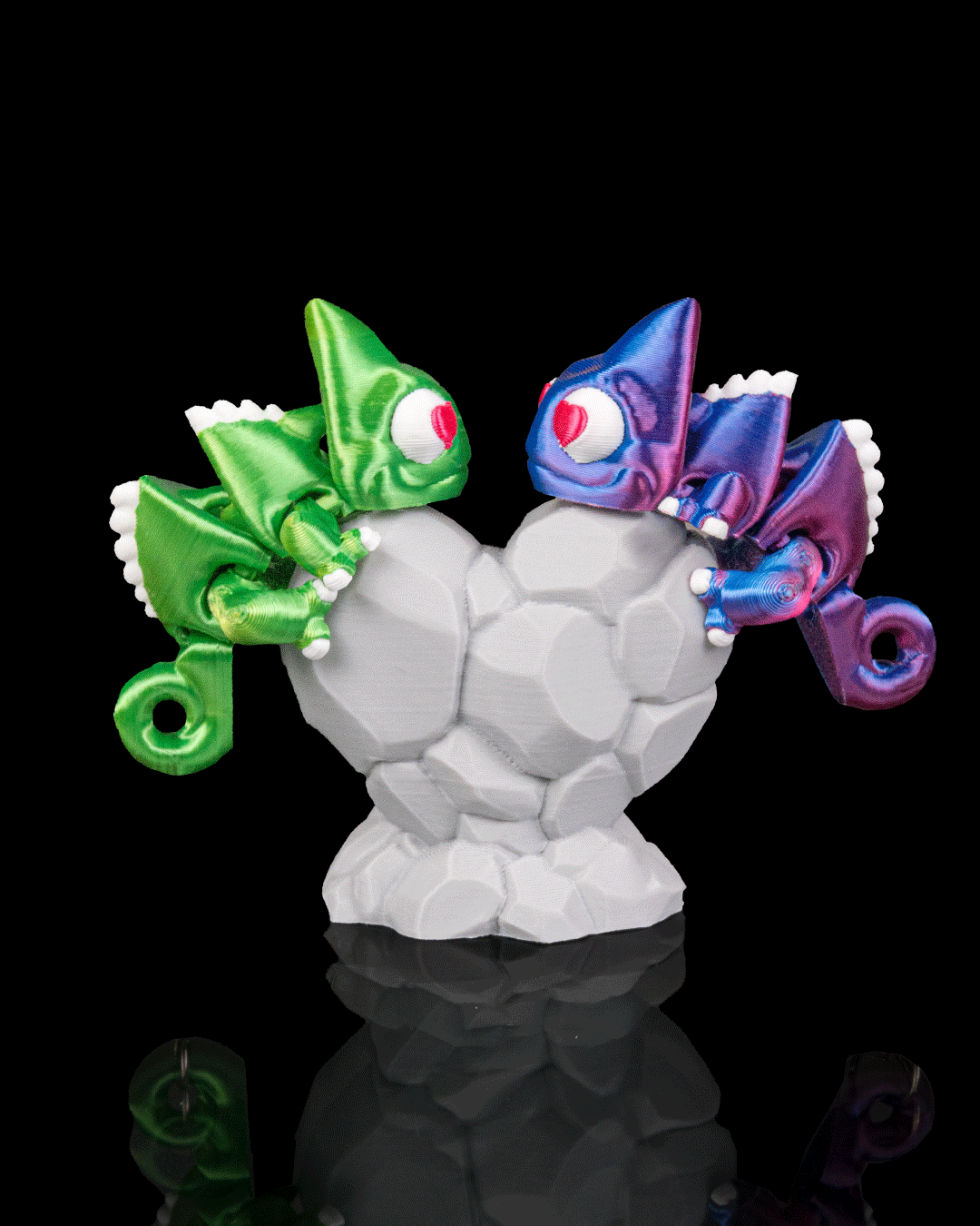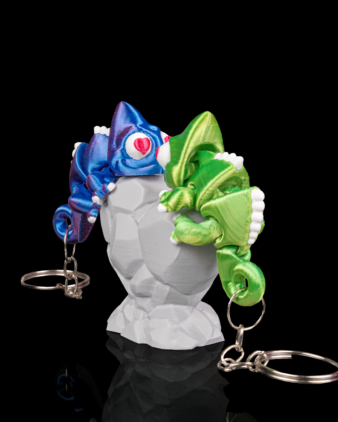 Bring a splash of colour and clever charm to your collection with Chamele-Ones, an eye-catching set featuring two articulated chameleon keyrings and a sculpted heart they cling to together. These playful creatures wrap themselves lovingly around the heart centrepiece, their curled tails and jointed limbs creating expressive, lifelike poses from every angle.