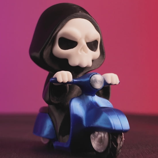 The Grim Rider takes spooky style to the streets. This 3D-printed figure depicts a skeletal motorcyclist, gripping handlebars with a determined, otherworldly presence. The Reaper is racing straight out of a nightmare.