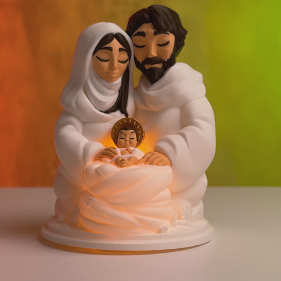 Graceful and serene, this 3D-printed Holy Family scene beautifully captures the quiet wonder of Christmas. Standing at approximately 15 cm tall, it depicts Mary, Joseph, and Baby Jesus in a tender moment of peace and love. A soft inner glow (from an optional LED light) illuminates the scene, symbolizing the warmth and hope of the season.