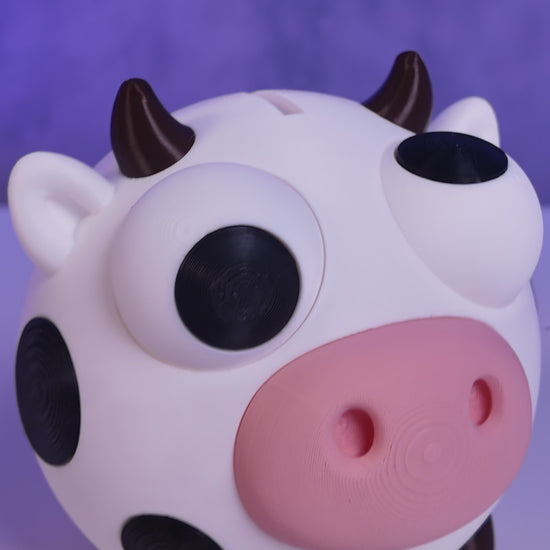 Its plump, rounded body is finished in a smooth, high-quality print, with adorable little legs that keep it standing steady. The face features a broad, friendly muzzle, tiny nostril details, and a pair of wide, cartoon-like eyes that give it a playful personality. Two perky ears and a pair of small, curved horns complete the look, while a coin slot on top makes it easy to “feed the cow” your spare change.