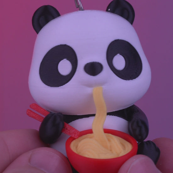 Standing at roughly 7 cm tall, this 3D-printed panda keyring captures a perfectly relatable moment: total noodle obsession. With a round, expressive face, tiny ears, and classic panda markings, Pandinner sits happily slurping noodles from a bright red bowl, chopsticks in hand and zero shame in sight. The flowing noodle detail adds motion and humour, making the figure feel alive despite its compact size.